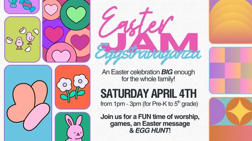 Families, get ready for an EXCITING Easter celebration like never before! It's our first-ever, "Easter Jam Eggstravaganza" – an Easter celebration BIG enough for the whole family! If you're the parent of a child in PreK through 5th grade, make sure to join us for a FUN time of worship, games, an Easter message, and Egg Hunt! You don't want to miss this special day planned JUST FOR YOU! And let's make this even more fun, invite a friend or neighbor to come with you! Use (and share) the link below to register and let us know you're coming!
